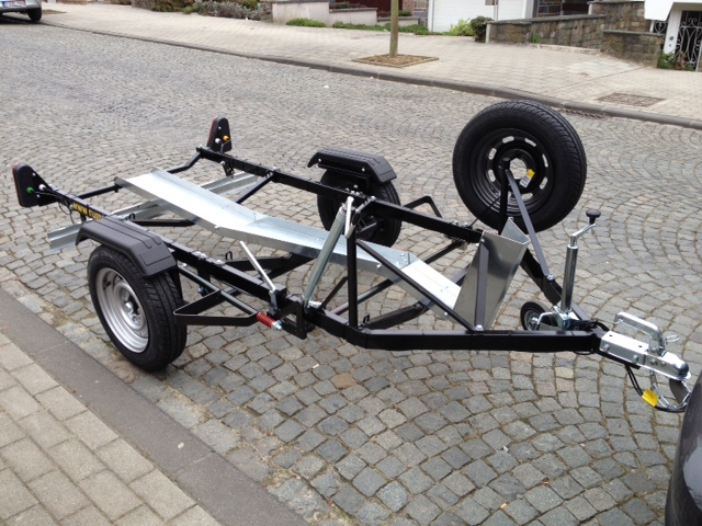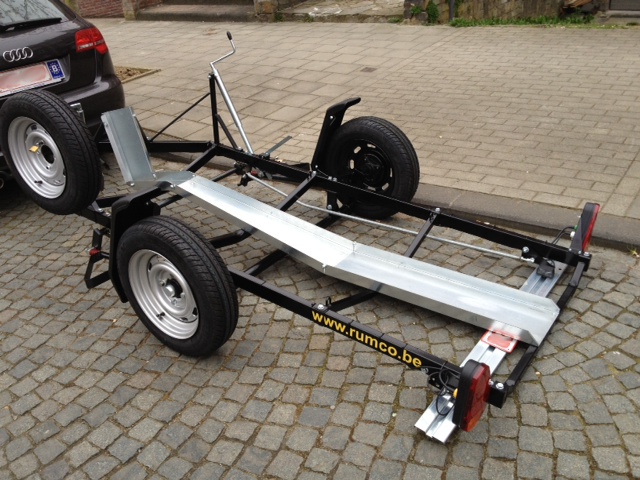 Remorque moto 1 rail avec levier pour la descendre très facilement. Très pratique pour charger et décharger seul sans aucun effort grâce à la manivelle permettant de descendre tout le rail jusqu'au sol.